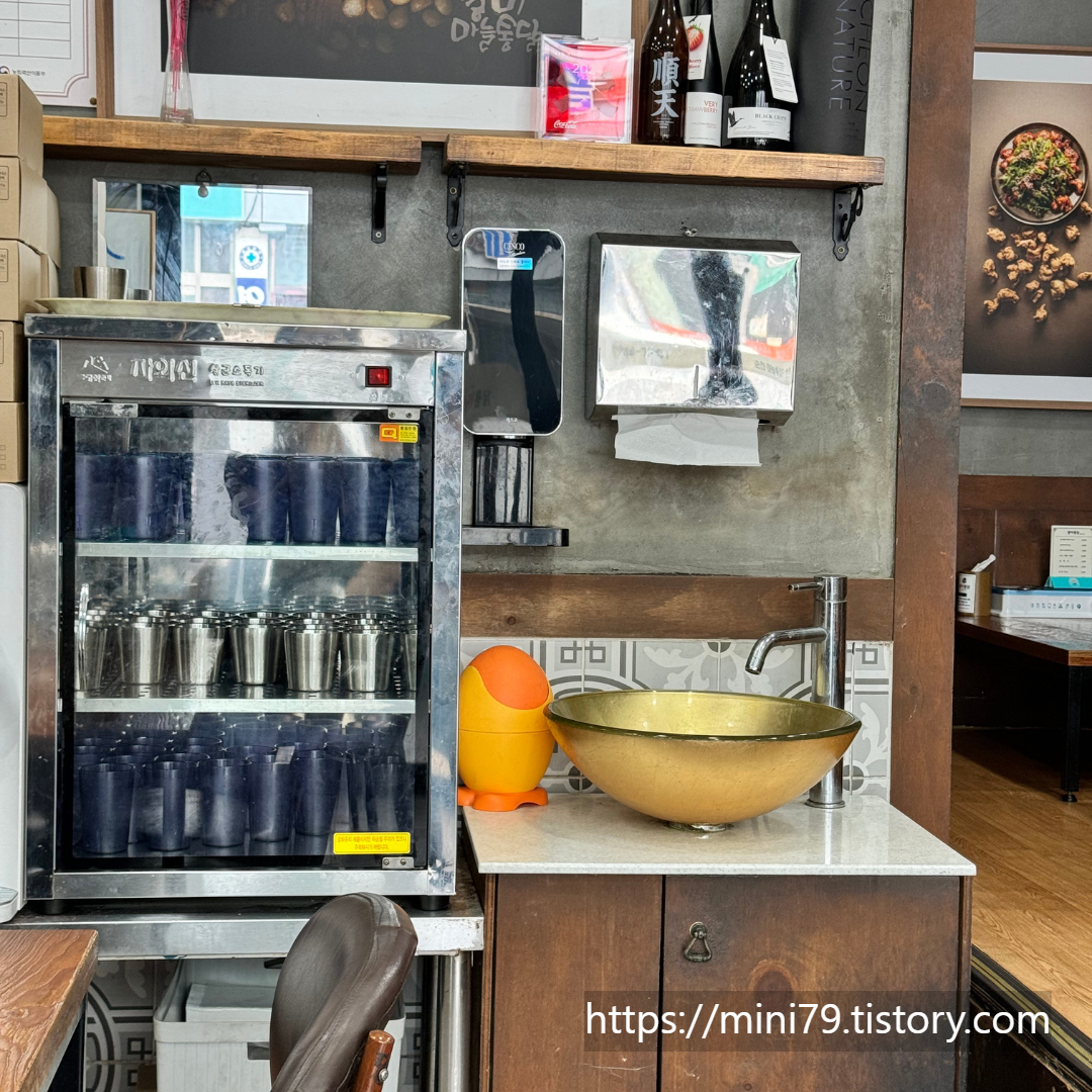 깨끗하게 손 씻을 수 있는 세면대. 식당 내부에 손을 씻을 수 있도록